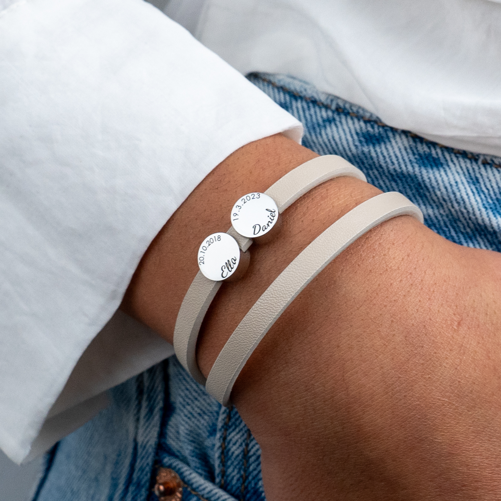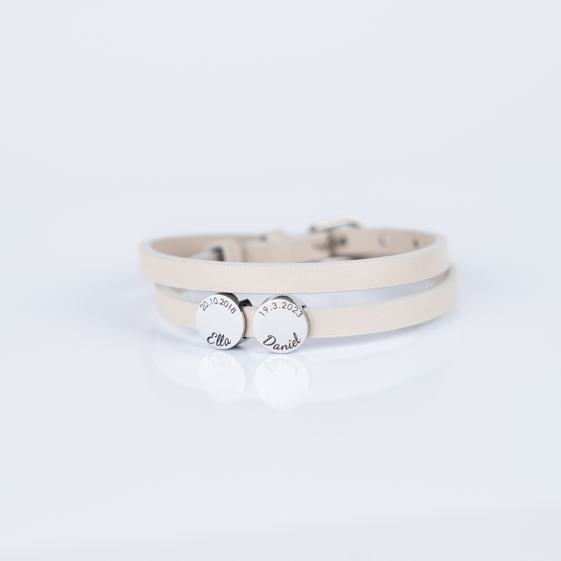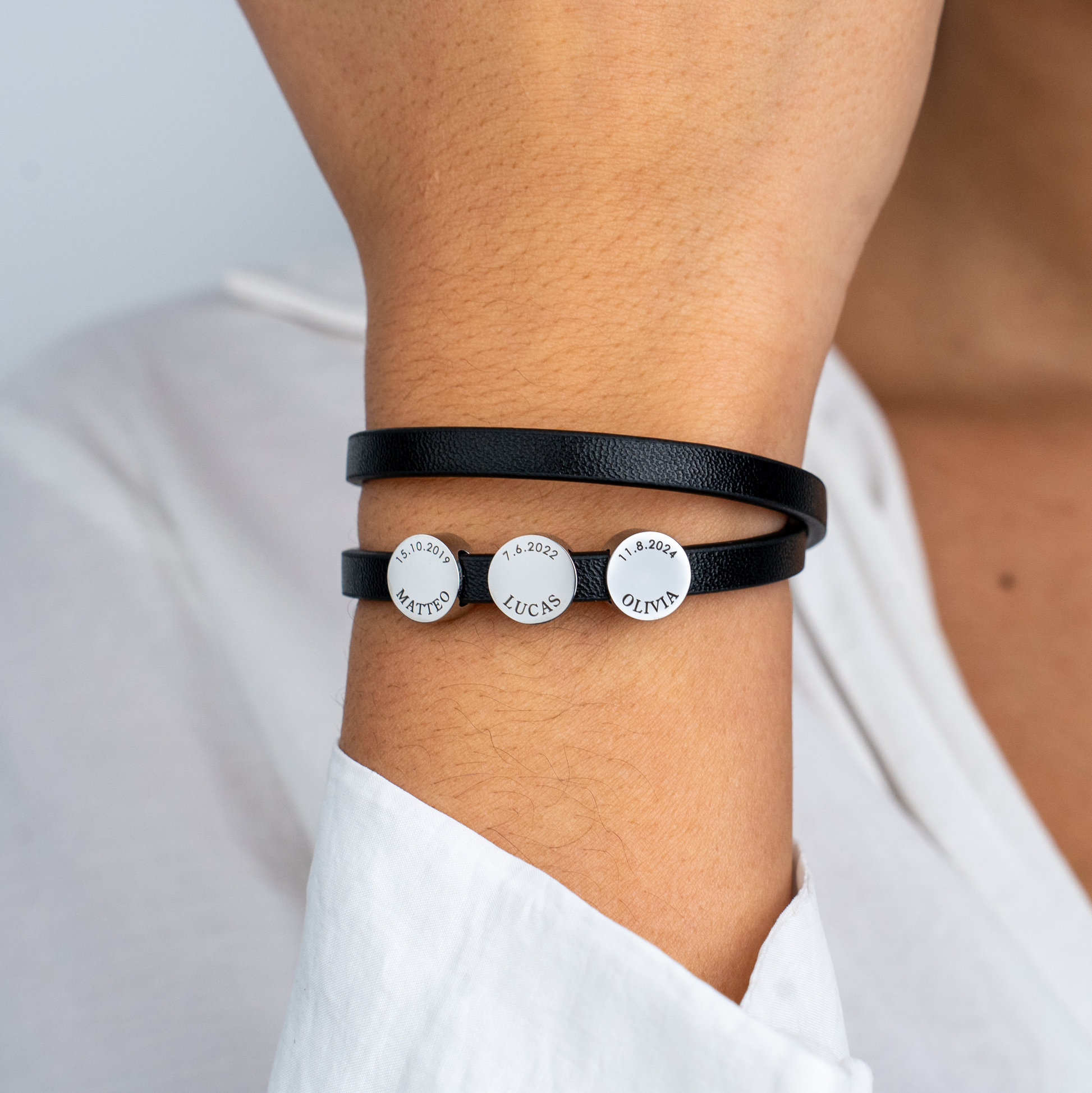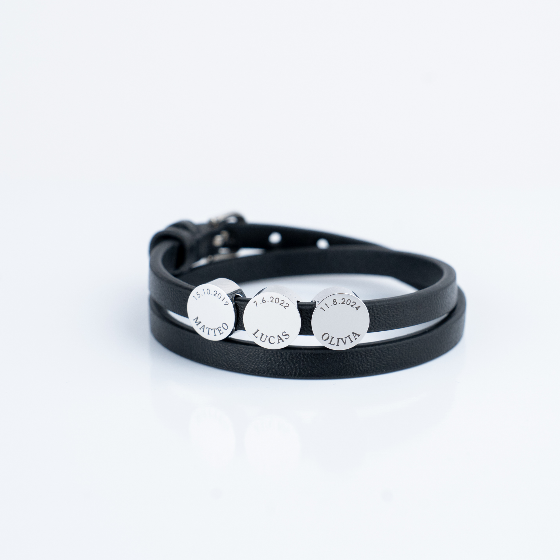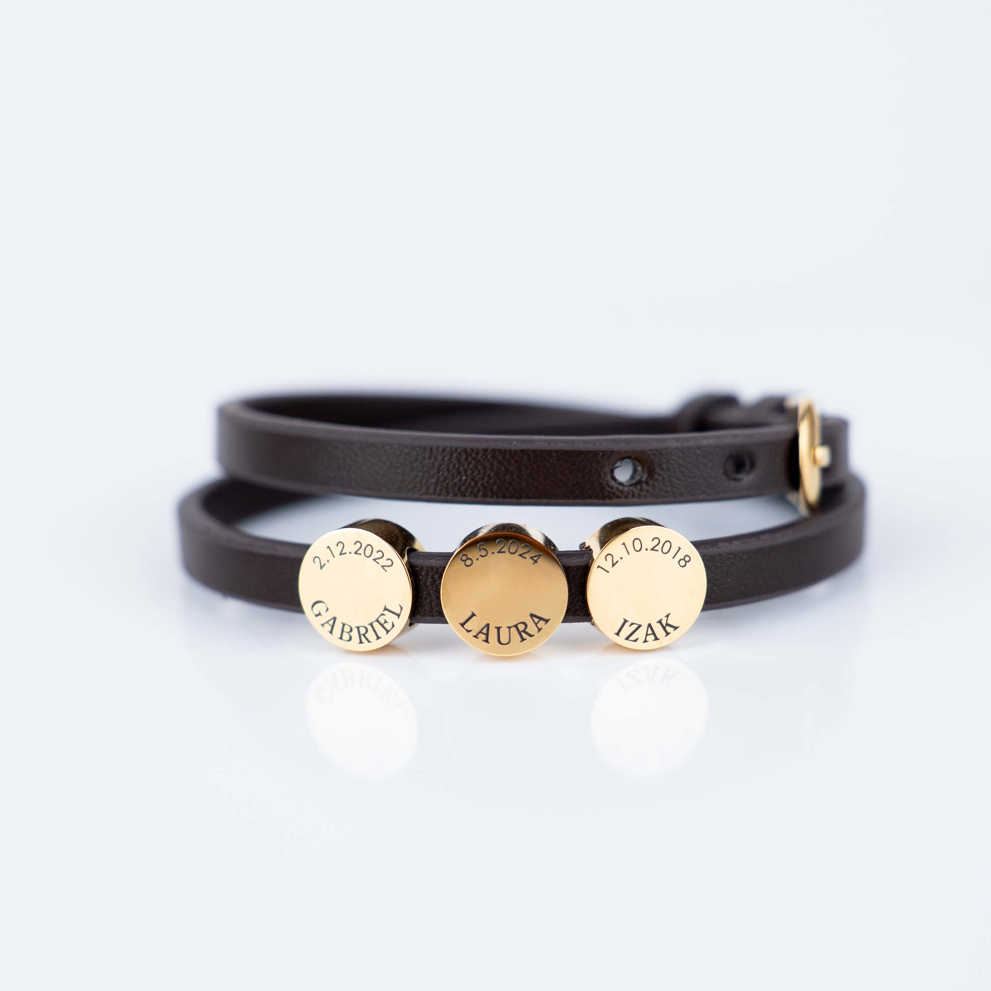 Je navržen pro ženy, které si váží hlubokých vztahů, a obsahuje pozlacené disky s vyrytými jmény a daty - každý z nich je nadčasovou připomínkou vašich dětí nebo zvláštních okamžiků. Elegantní kožený řemínek mu dodává moderní nádech a činí z něj smysluplnou památku, kterou budete nosit každý den.
